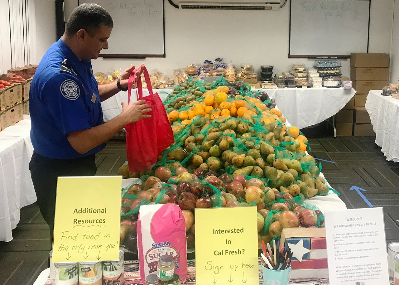 John Wayne Airport transformed a conference room on January 21, 2019 into a mini food pantry operated by the Second Harvest Food Bank Orange County to provide donated produce, canned goods, toiletries, diapers, bread, milk and eggs to the approximately 400 Transportation Security (TSA) agents and federal employees based at the Airport; and will remain available for the duration of the partial government shutdown.