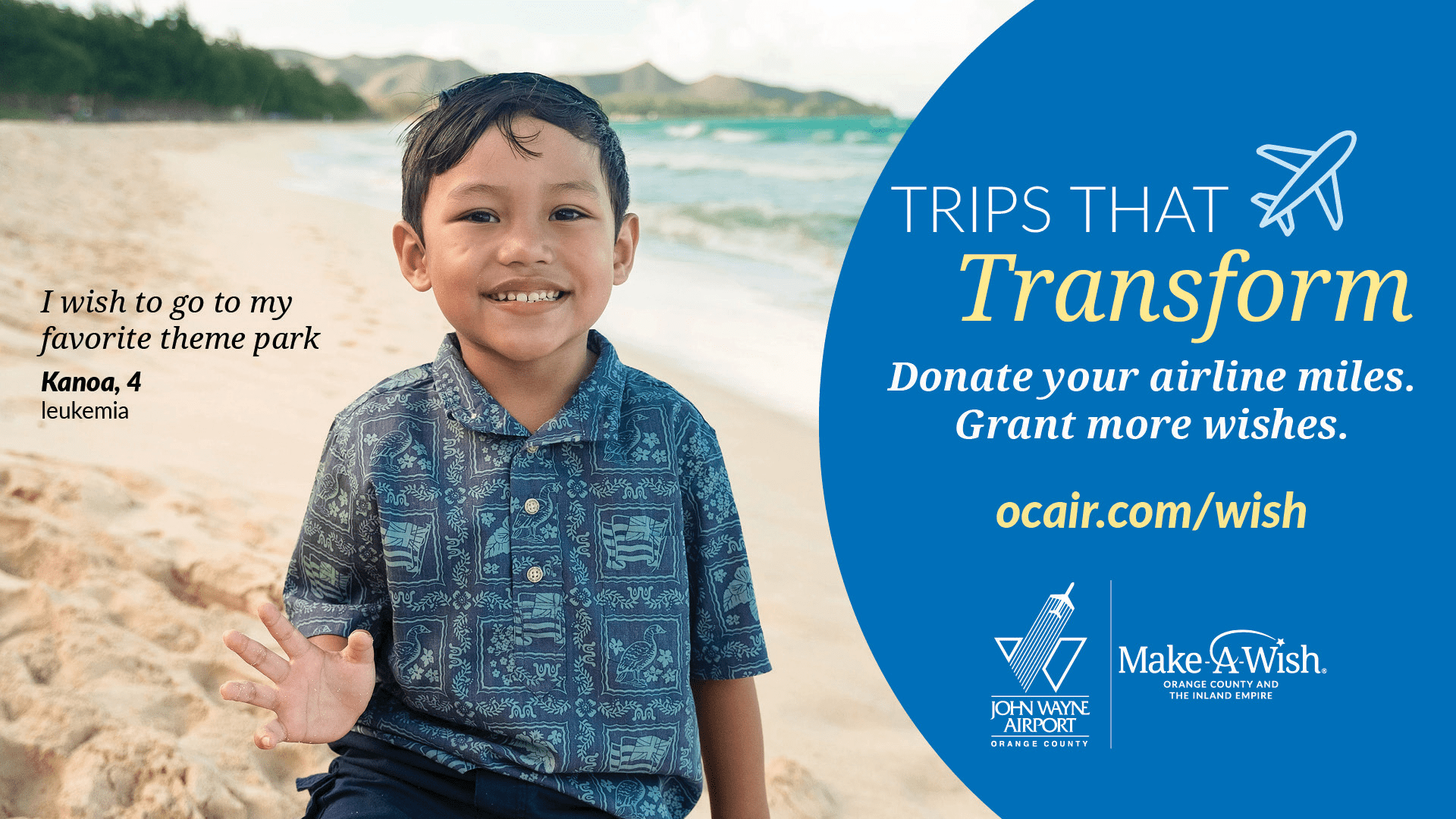 The ‘Trips that Transform’ campaign takes flight during August at John Wayne Airport through a partnership with Make-A-Wish® Orange County and the Inland Empire to help grant wishes for local children battling critical illnesses through the donation of unused, low balance or soon-to-expire airlines miles for American, Delta, JetBlue, Southwest, or United Airlines.