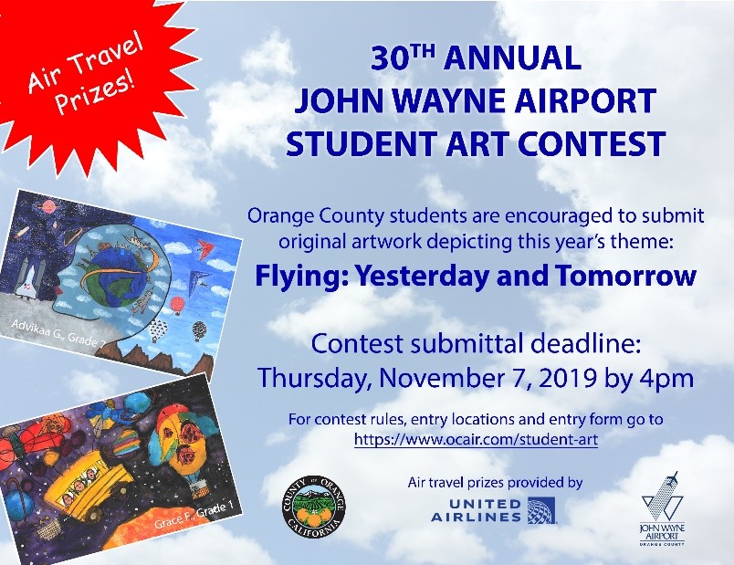 John Wayne Airport invites Orange County public and private school students, grades K-12, to enter the 30th Annual John Wayne Airport Student Art Contest. Students can tap into their imagination, grab their favorite set of crayons, markers, pencils or paints and create artwork depicting this year’s theme “FLYING: YESTERDAY AND TOMORROW.”