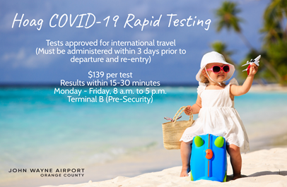 Hoag Rapid Testing is located in Terminal B on the Departure (upper) Level before security screening. Testing is open to prospective travelers and community residents for $139, and is available Monday through Friday, from 8 a.m. to 5 p.m.
