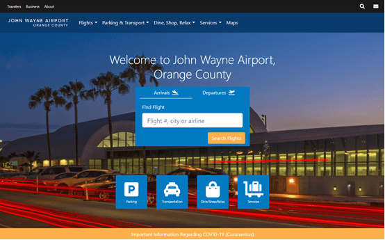 The site is designed to work seamlessly on a mobile platform, offering simple navigation from any device or desktop. Organized in three separate sections – Travelers, Business, and About – the responsive navigation provides intuitive and clear pathways to all Airport related information. Of course, the Search tool is always available to help as well.