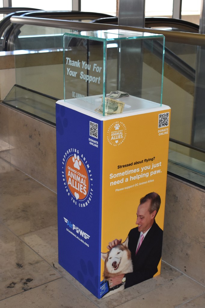 OC Animal Allies is a local 501 (c)(3) organization. There are seven donation receptacles located throughout the Terminal at each security screening area. Why not donate that noisy pocket change before getting on your flight and help an organization that also brings smiles and comfort to those in hospitals, schools, and senior centers.