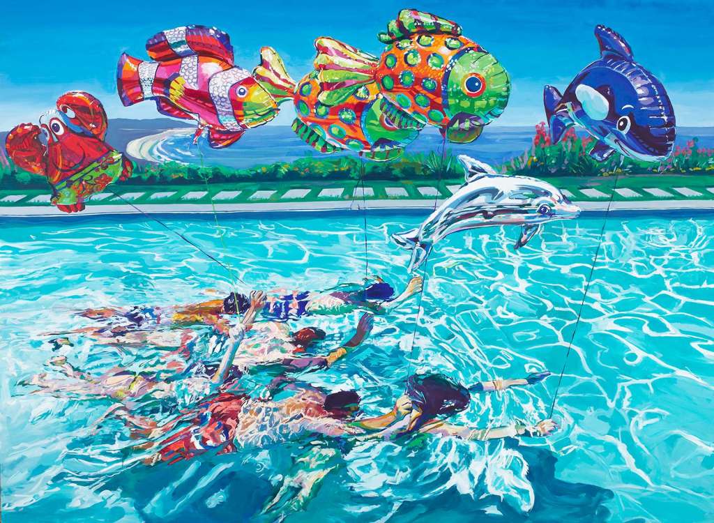 “Endless Summer” by Betsy Enzensberger and Sarah Stieber celebrates the sunny spirit of Orange County. Located in Terminal A, Enzensberger’s resin sculptures showcase 82 custom resin popsicles, while Stieber’s “Water” series features lively pool-themed paintings. Both works invite viewers into vibrant scenes of a seemingly never-ending summer.
